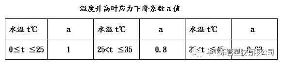 a-压力下降系数,即当管材输送高温水时由于温度升高引起管道工作压力下降的系数,可按下表选用: