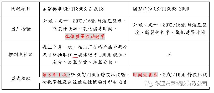 本次标准变更删除了 PE63 材料制造的管材,仅包含 PE80 和 PE100 材料制造的管材;其次增加了产品规格范围要求最大工作压力不大于 2.0MPa 和参考工作温度为 20℃ 的要求,而在物理、力学性能方面则增加了灰分、炭黑含量,耐慢速裂纹增长性能的检测,并要求产品的出厂检测增加“熔体质量流动速率”项目,其次增加了控制点检验以及要求型式检测每3年一次的规定。总体本次新标准的修订对管材的品质要求更高,更加严格,对产品的检验项目更加细化。